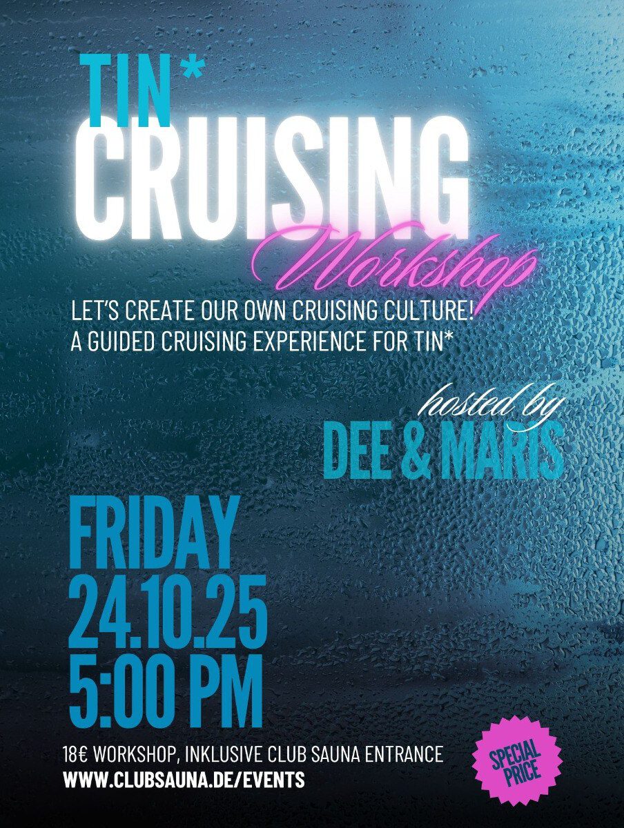 Cruising culture in Berlin has historically been shaped and dominated by gay male only venues. Now, it’s time to reimagine and translate the language of those spaces into our own practices. Together with you, we want to explore what queer cruising can look and feel like in our TIN* community.